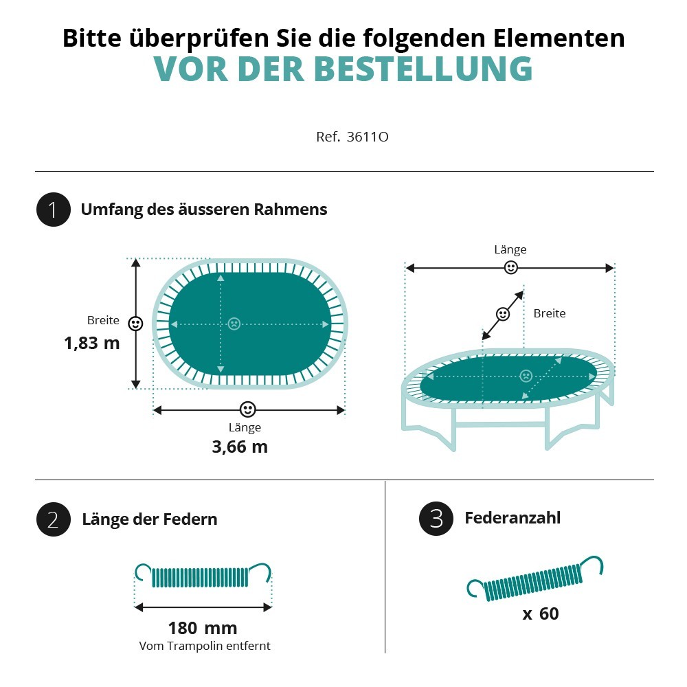 - Dieses Sprungtuch ist geeignet für unser Ovalie 360-Modell sowie für jedes ovale Trampolin mit einem Durchmesser von 3,60 x 1,80 m, das mit 60 x 180 mm Federn ausgestattet ist.