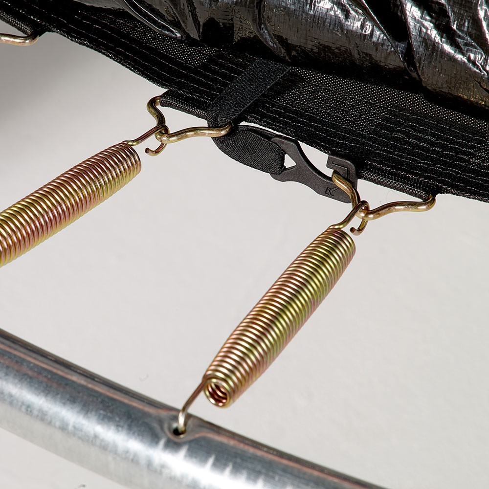• Hinweis: Achten Sie vor Ihrem Kauf auf die Anzahl und die Länge der Federn Ihres Trampolins zu überprüfen. Dieses Sprungtuch für Trampoline Ø 4,27 m kann nur auf ein Trampolin mit 88 Federn, die 145 mm lang sind, installiert werden. Um die Länge der Federn zu ermitteln müssen, Sie eine abmontieren und von einem Haken zum anderen messen. Drücken Sie in die Mitte der Spirale und entfernen Sie den am Stahlrahmen befestigten Haken.