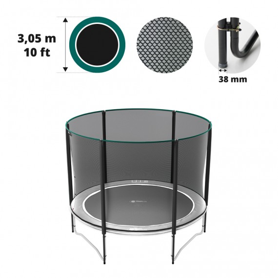 Komplettes Sicherheitsnetz für das runde Trampolin Ø 305. Dieses Set beinhaltet das Fangnetz, die Randpfosten und die Pfostenschutzhüllen.