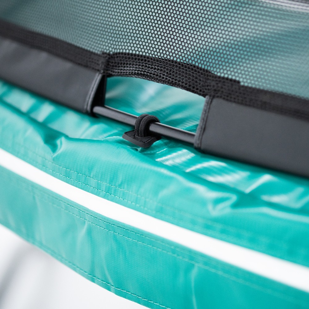 - Aus Polyester PE 160 g/m² mit extra feinen Maschen, um zu verhindern, dass die Springer sich die Finger darin einklemmen. Der Aufstieg auf das Sprungtuch erfolgt durch einen überlappenden Eingang, der sich mit Reißverschlüssen und Karabinerhaken verschlossen wird.