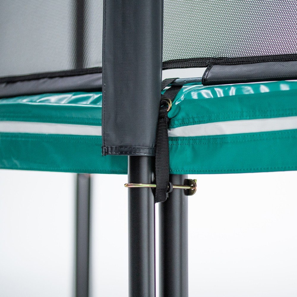 - Schutz & Sicherheit der Nutzer. Die oberen Pfosten Ihres Trampolins sind von 10 mm dickem Schaum und einer schwarzen PVC-Hülle bedeckt. Mit einer Höhe von 2,56 m schützt das Netz den Springer auch bei sehr hohen Sprüngen. Das Fangnetz wird von Fiberglasbögen gespannt, die am obersten Punkt des Netzes angebracht sind. Das Sicherheitsnetz wird durch Fiberglasbögen befestigt, die in den oberen und unteren Rand des Netzes eingefügt sind.